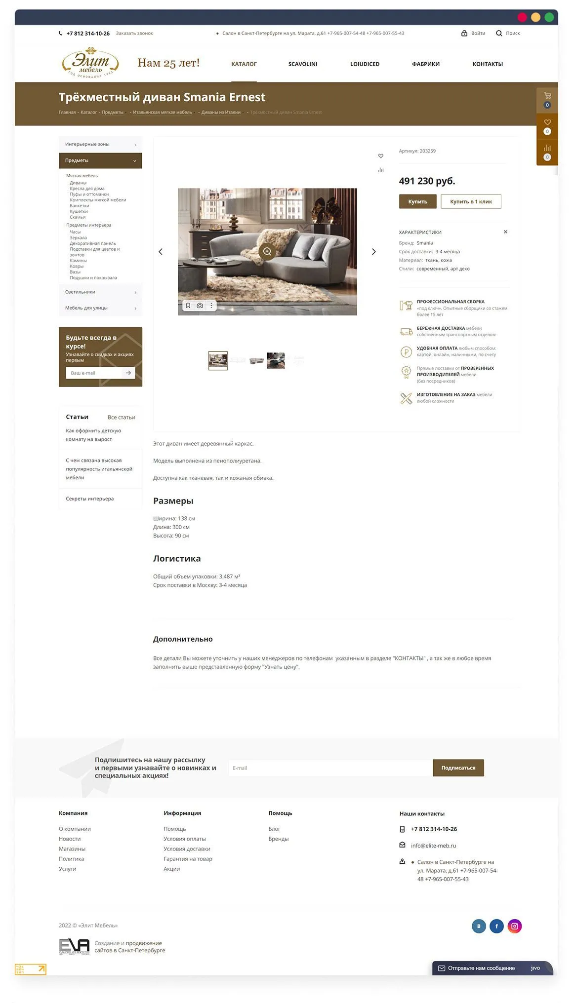 Настроили СЕО умного фильтра. В разделе «Бренды» доступен список из 162 итальянских производителей мебели. При переходе на детальную страницу бренда клиент может наблюдать отсортированные товары по выбранному производителю.